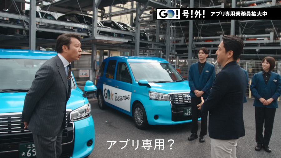「GOリザーブ篇」は新たな雇用の形で乗務員不足の解消を目指す取り組みを紹介する内容です。アプリ注文のみを受け取る専用車両『GO Reserve』とその専用乗務員『GO Crew』がいる現場に加藤リポーターが潜入。鮮やかな青い車体を前に加藤リポーターは思わず「思い切った色にしたな〜」と反応する様子も印象的です。